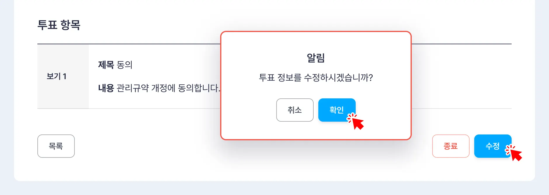 목록에서 [종료하기] 버튼을 클릭하면 설정된 일정과 관계없이 진행 중인 투표를 마감합니다.