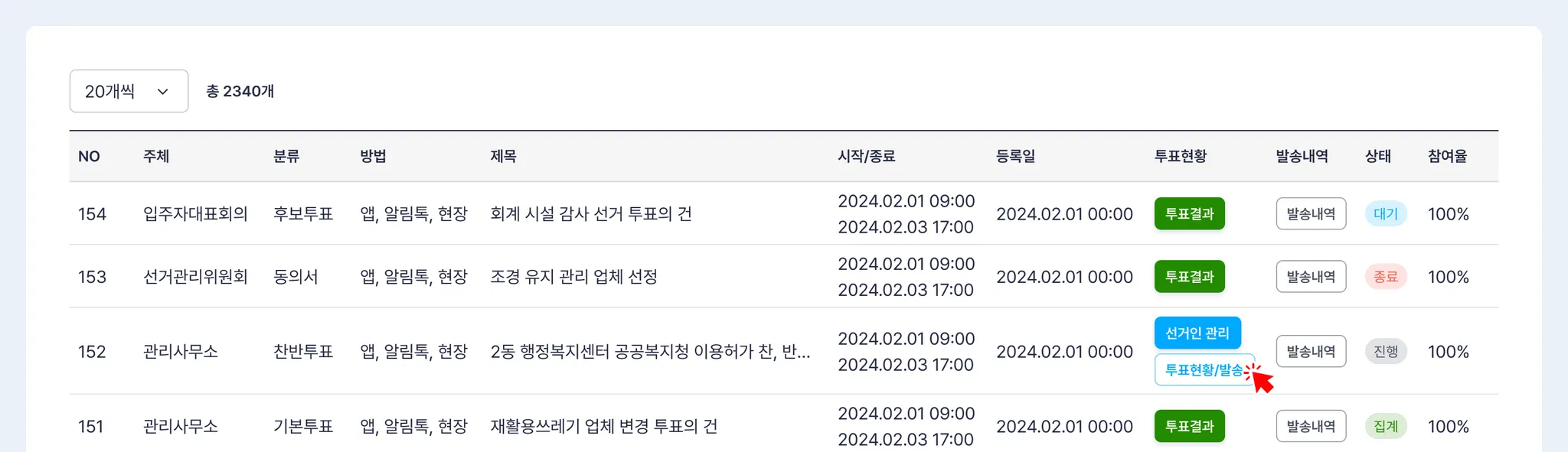 투표 목록에서 투표가 시작된 투표의 [투표현황/발송] 버튼을 클릭하세요.