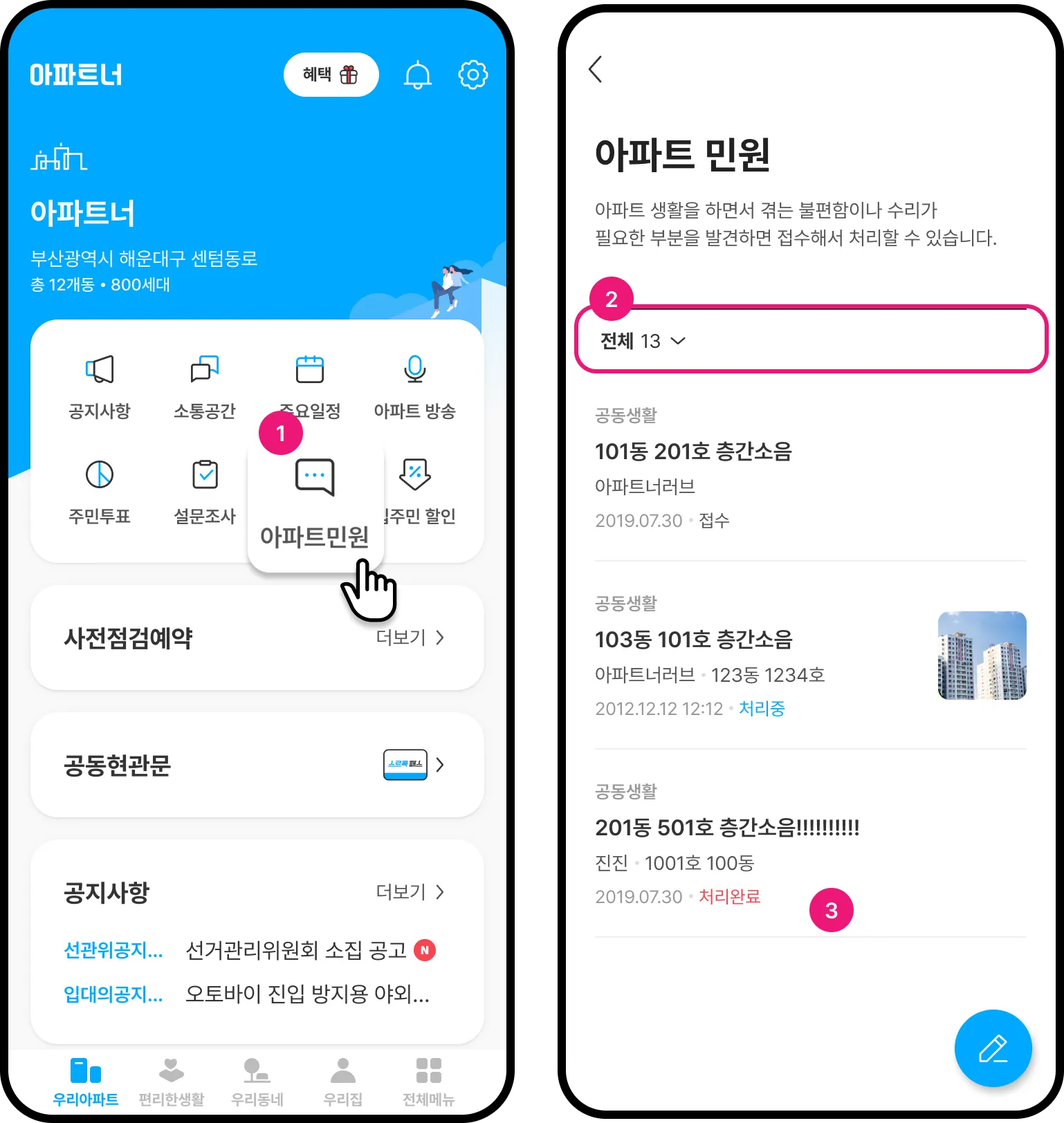 관리사무소에서 민원을 확인하고 처리중인 경우, [처리중]이라고 표시됩니다.