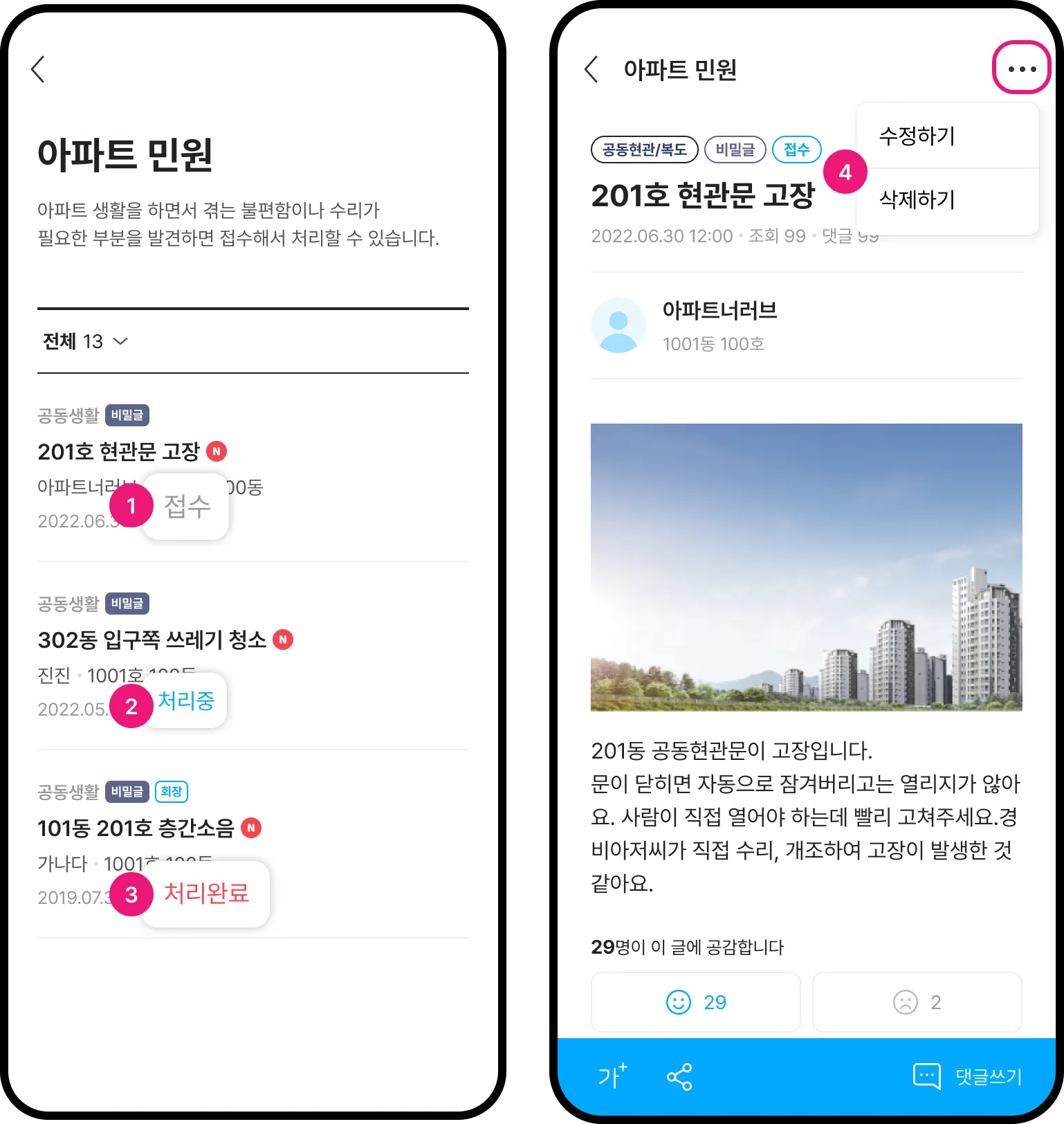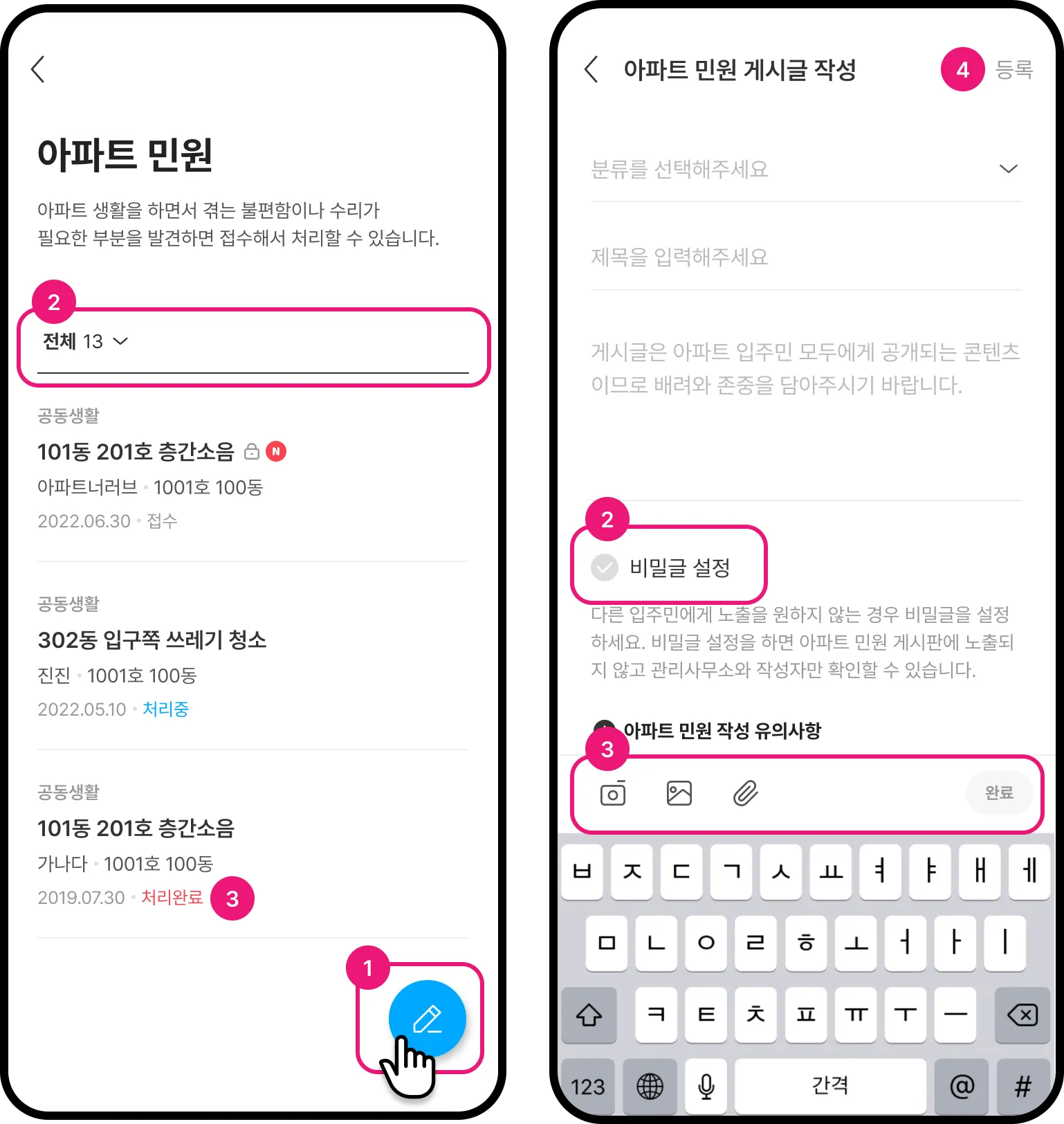 비밀글은 아파트 민원 게시판에 노출되지 않고 작성자와 관리사무소만 확인 가능합니다.