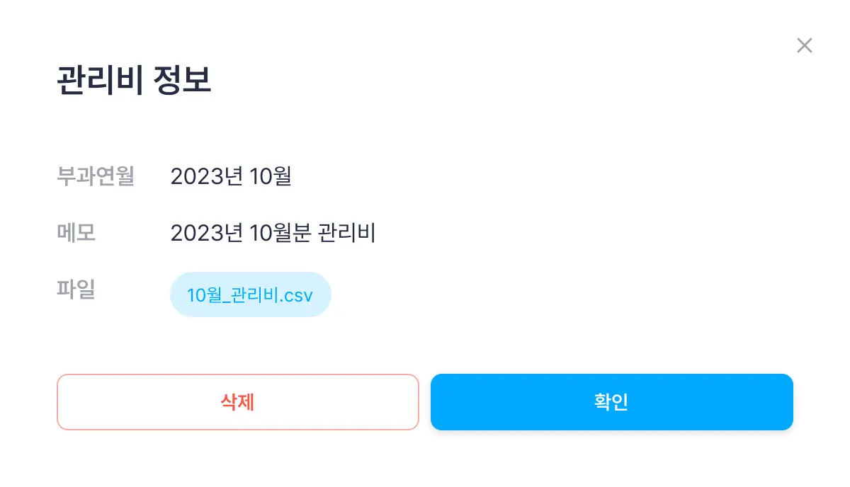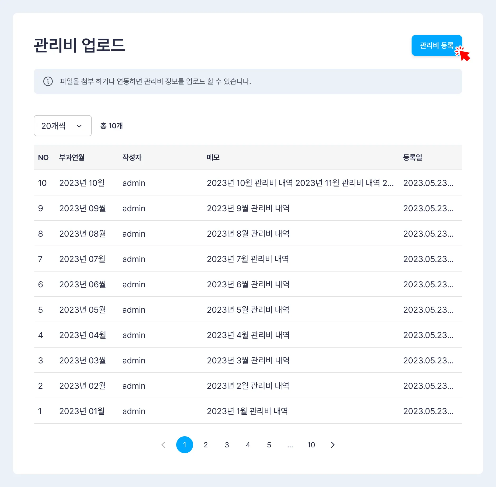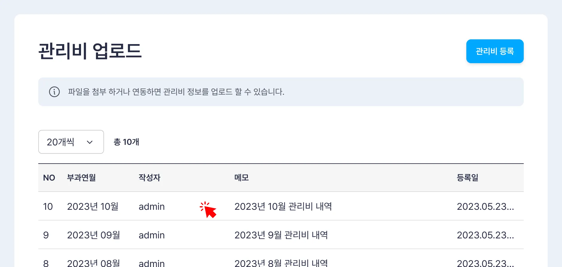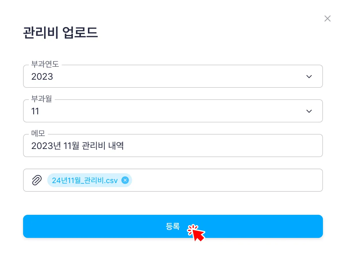 관리비 업로드 화면 상단의 [관리비 등록] 버튼을 클릭합니다.