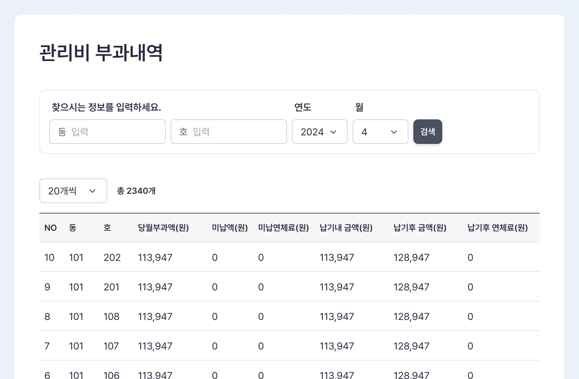 부과내역에서는 세대의 [ 동/호수/금액 ]만 조회됩니다.