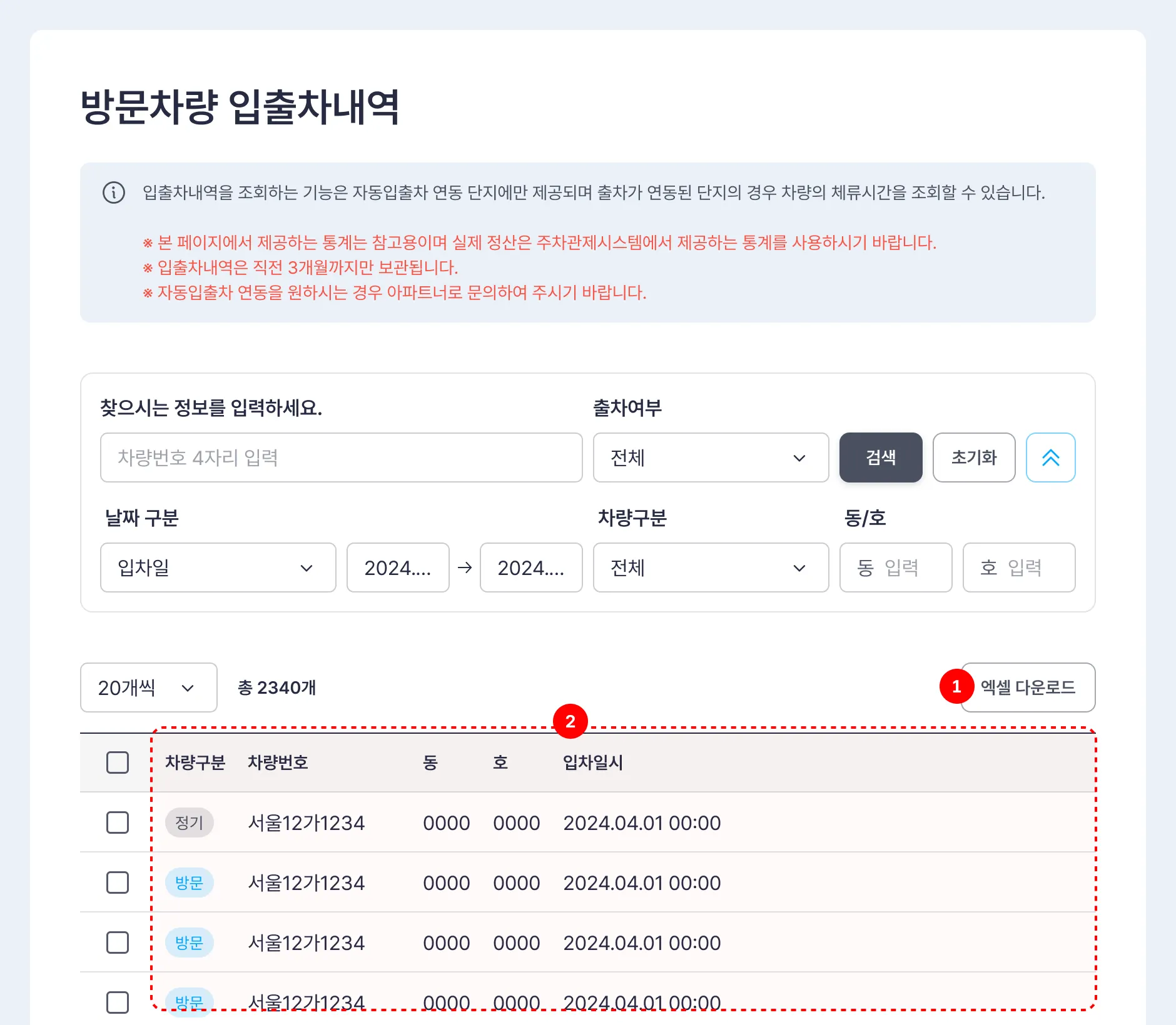 방문 차량 입출차내역은 설정에 따라 테이블 항목이 다르게 노출될 수 있습니다.