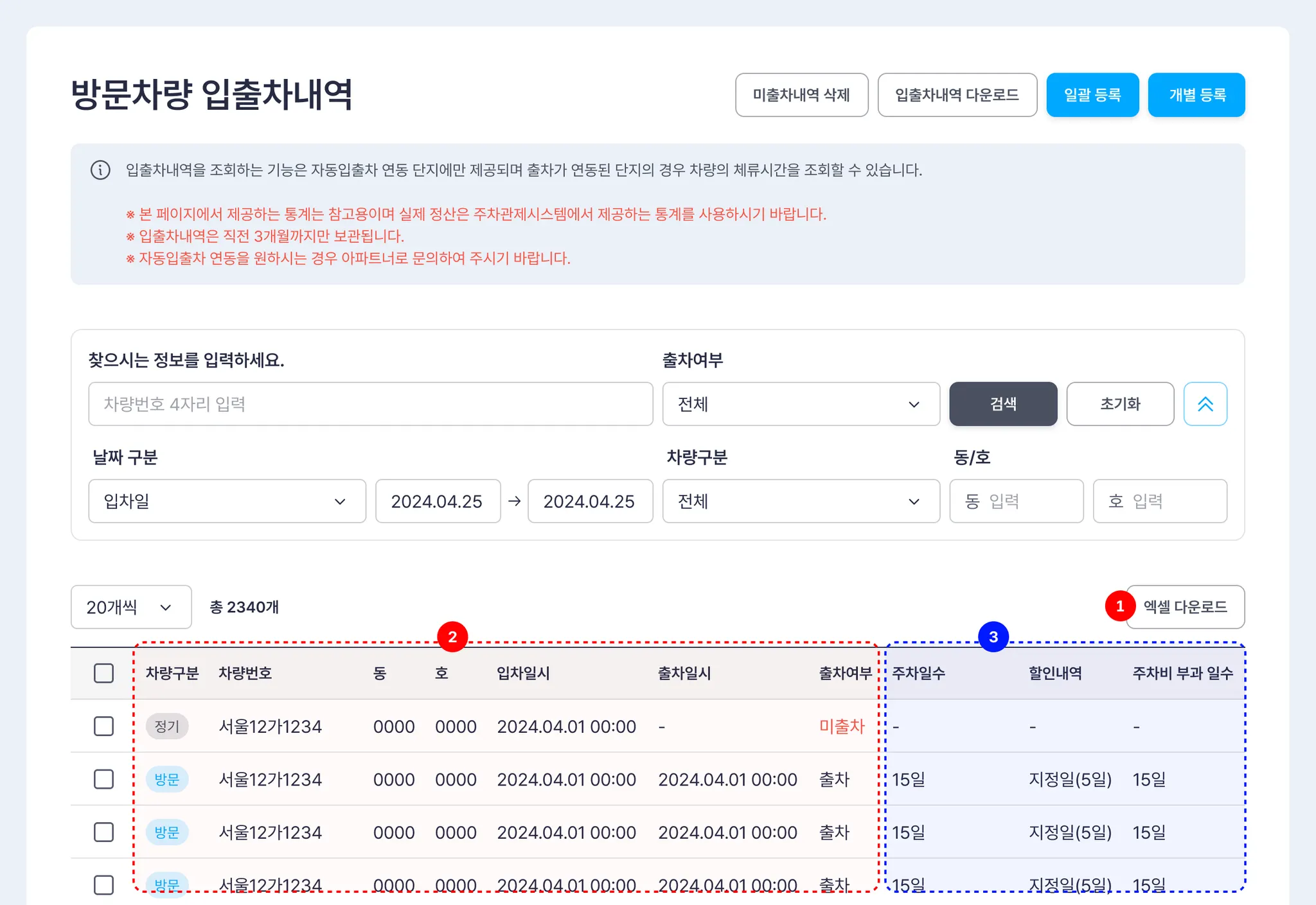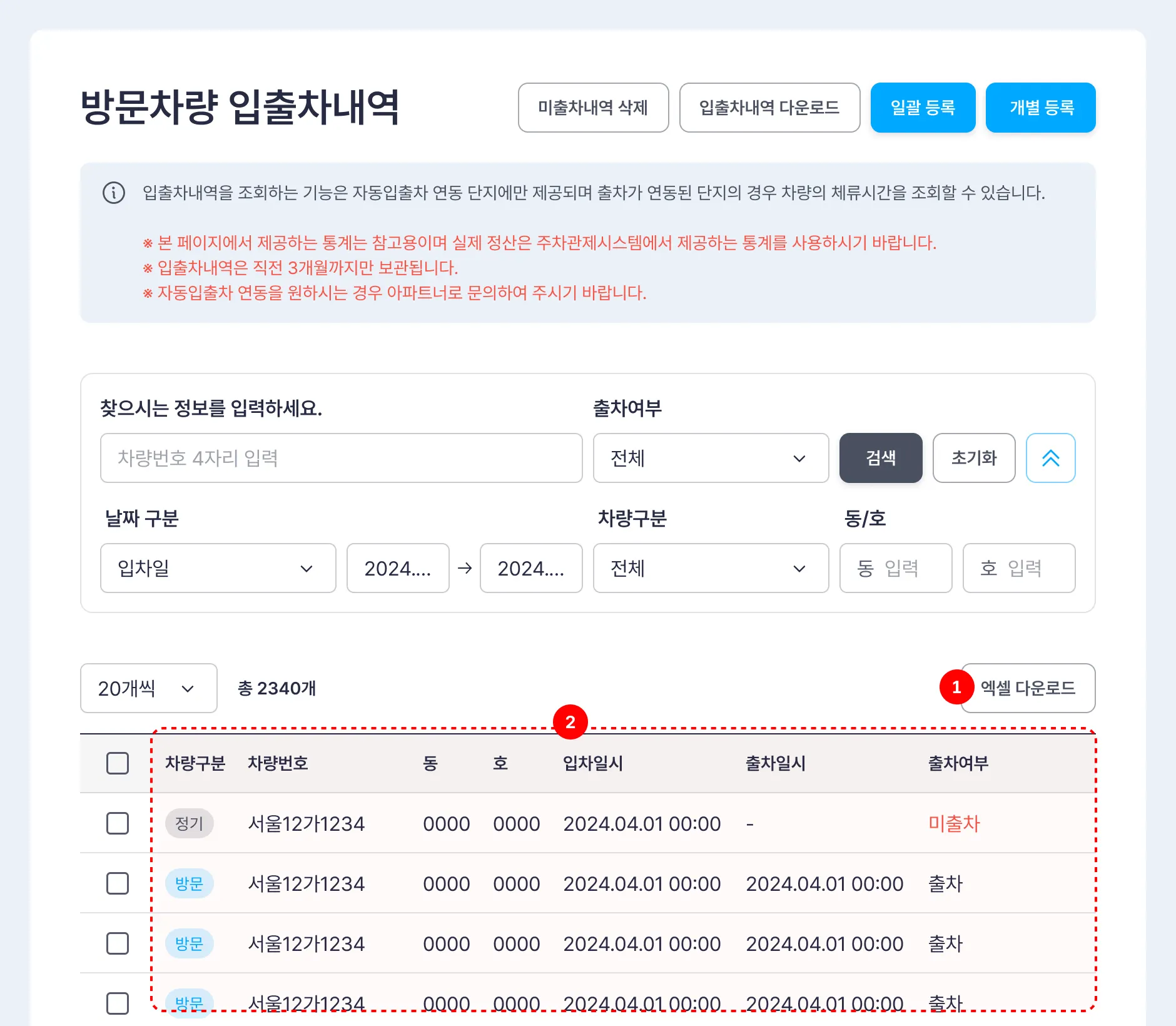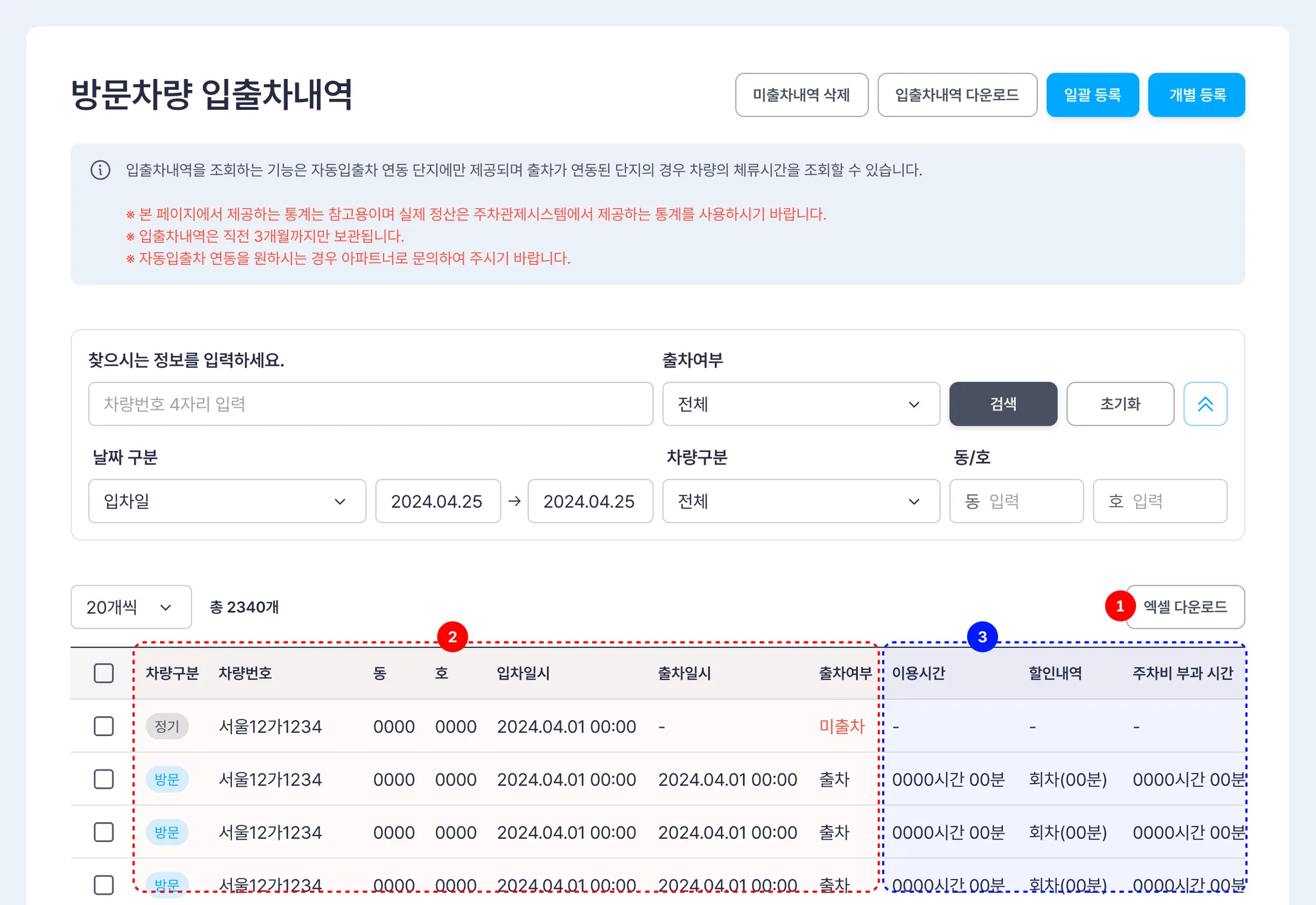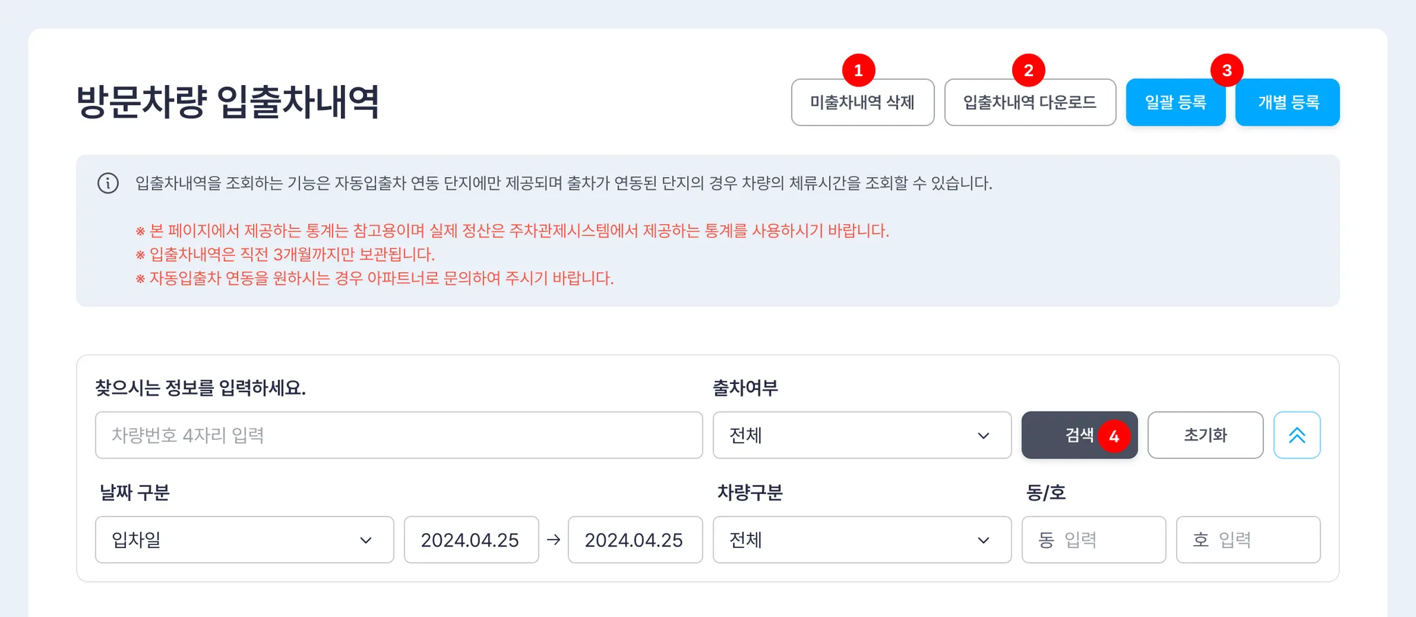 실제 입출차 일시와 상이하거나 미출차 처리된 차량내역은 관제업체에 문의하시기 바랍니다.