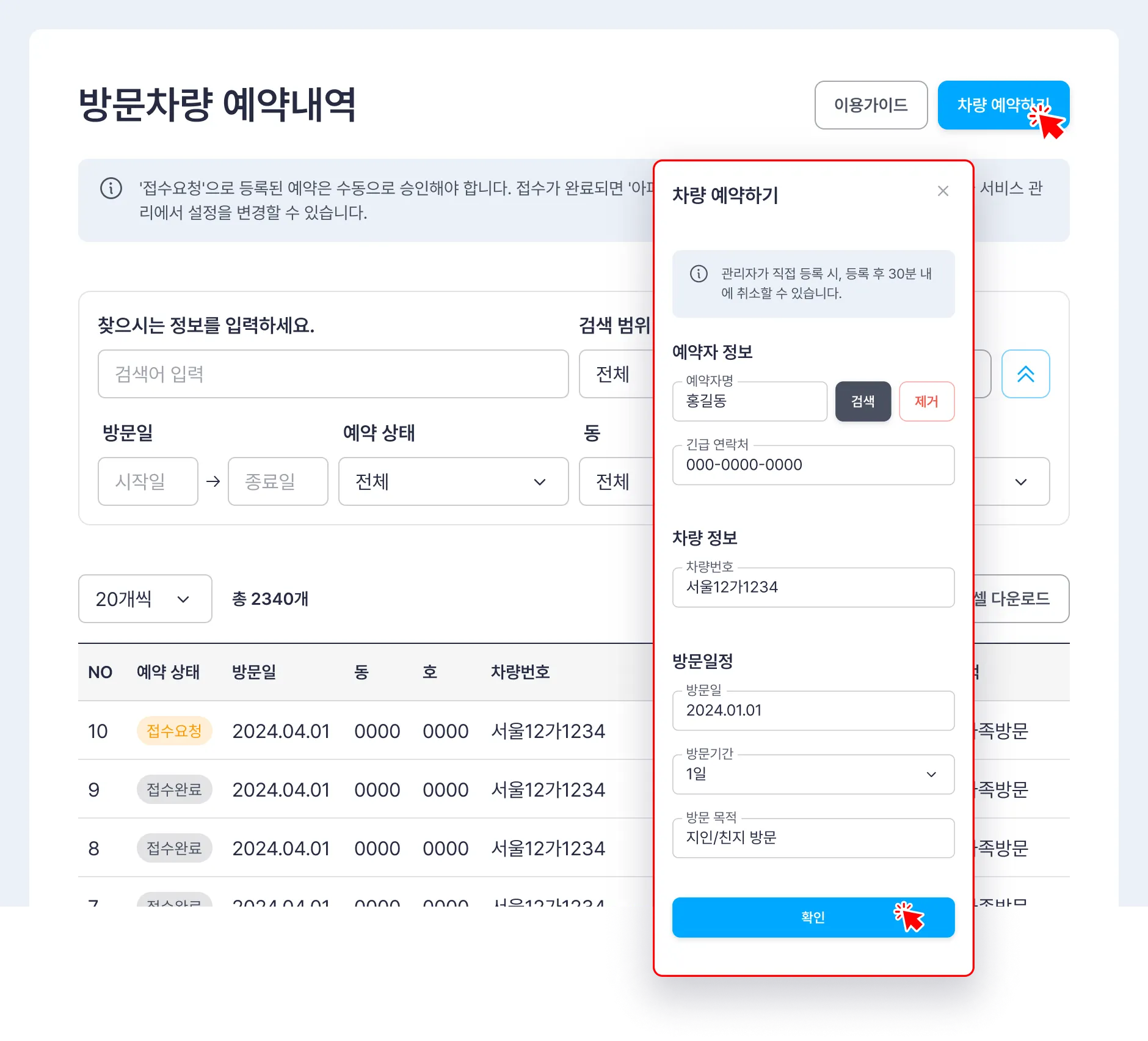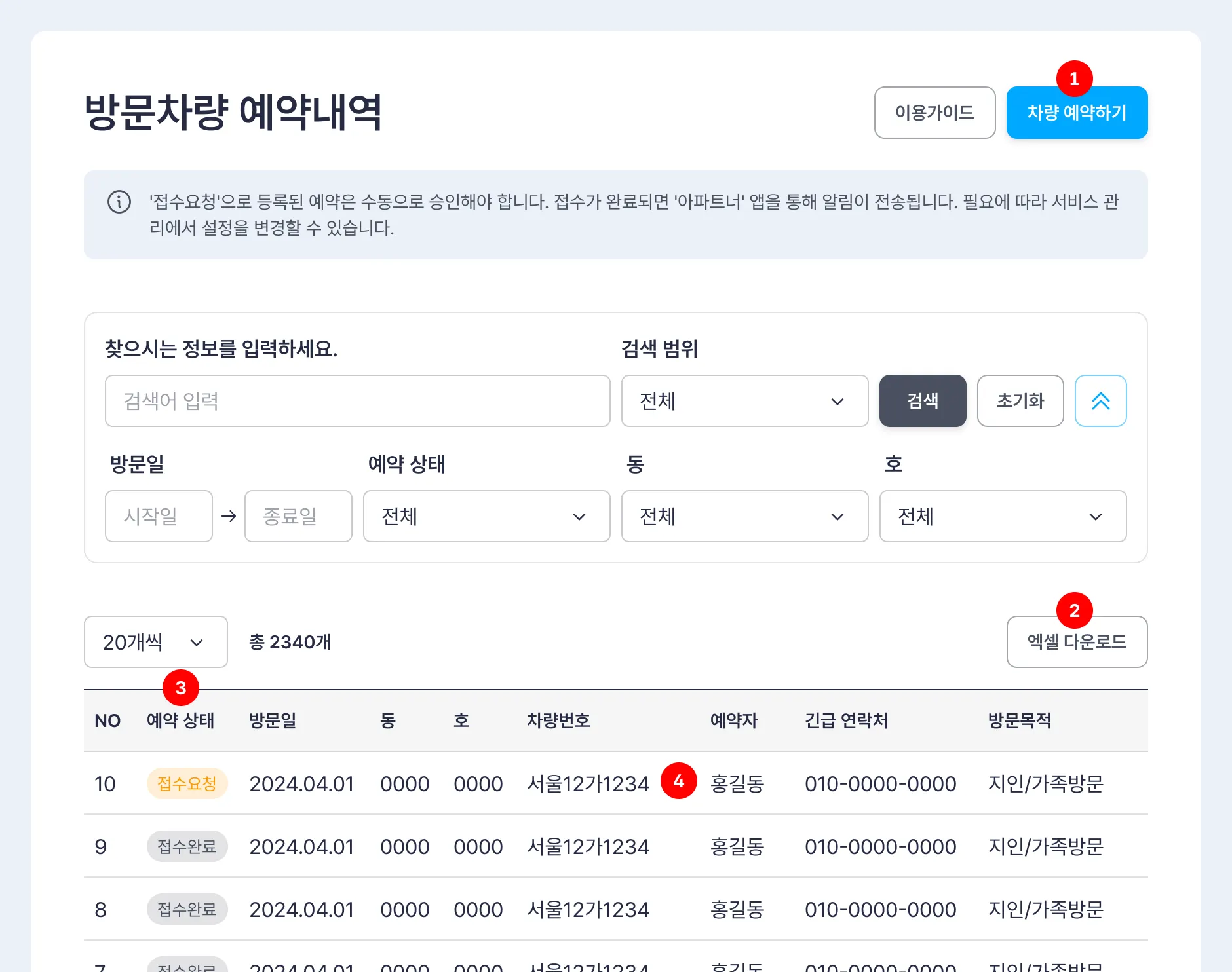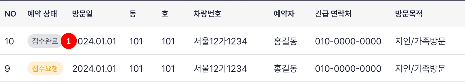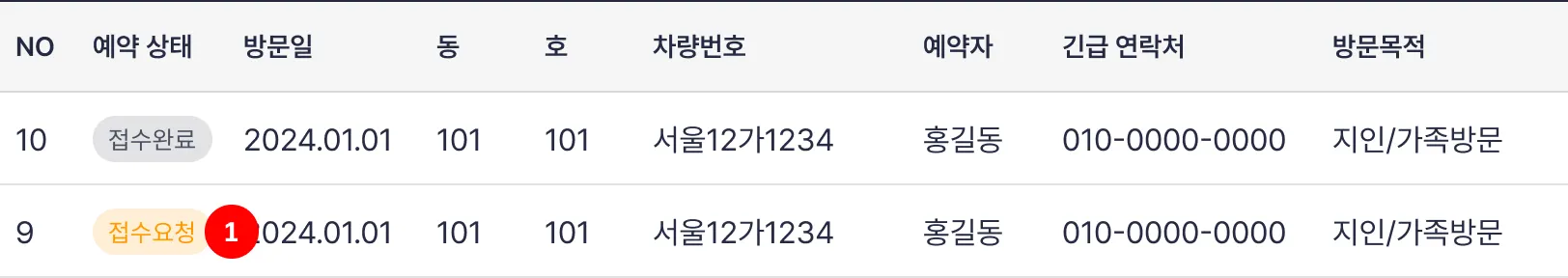 아파트너를 통한 입주민의 방문예약을 관리하는 화면입니다.