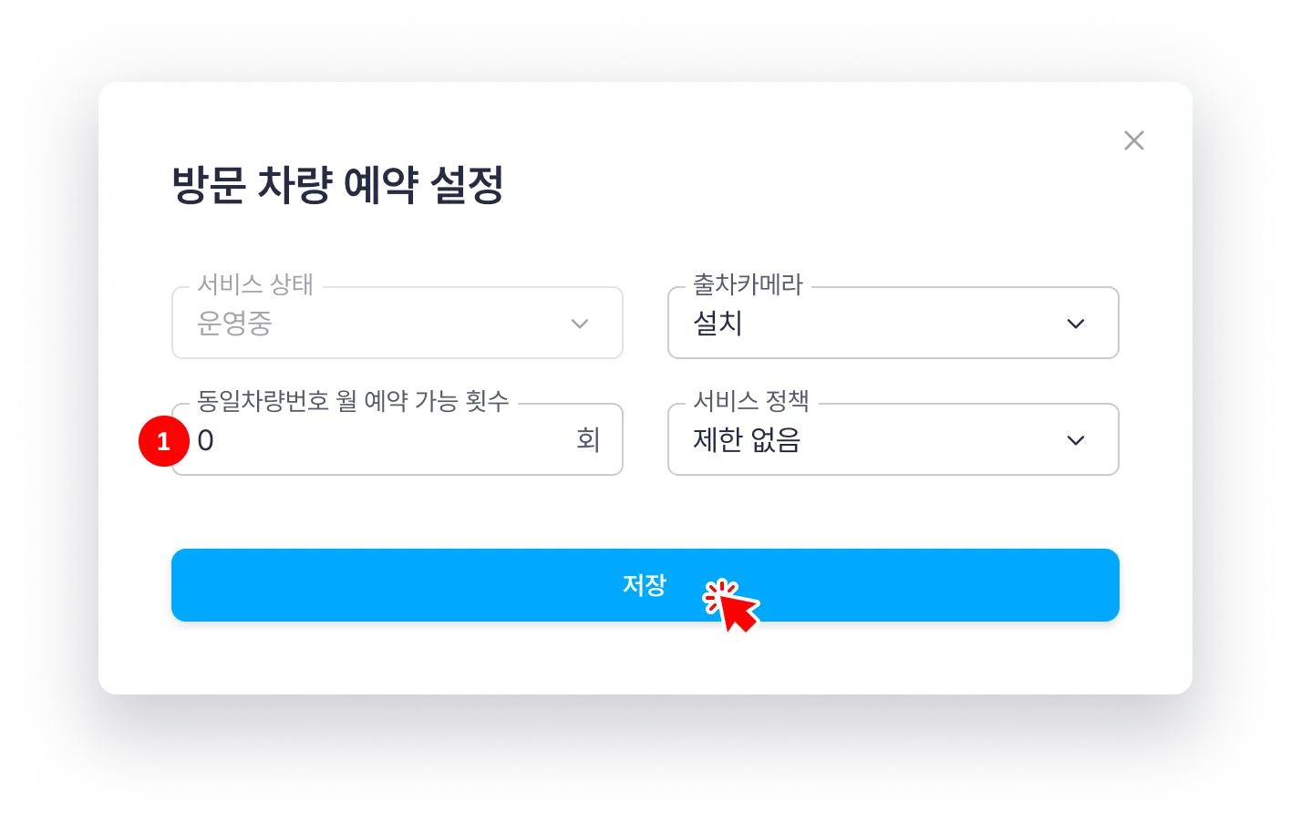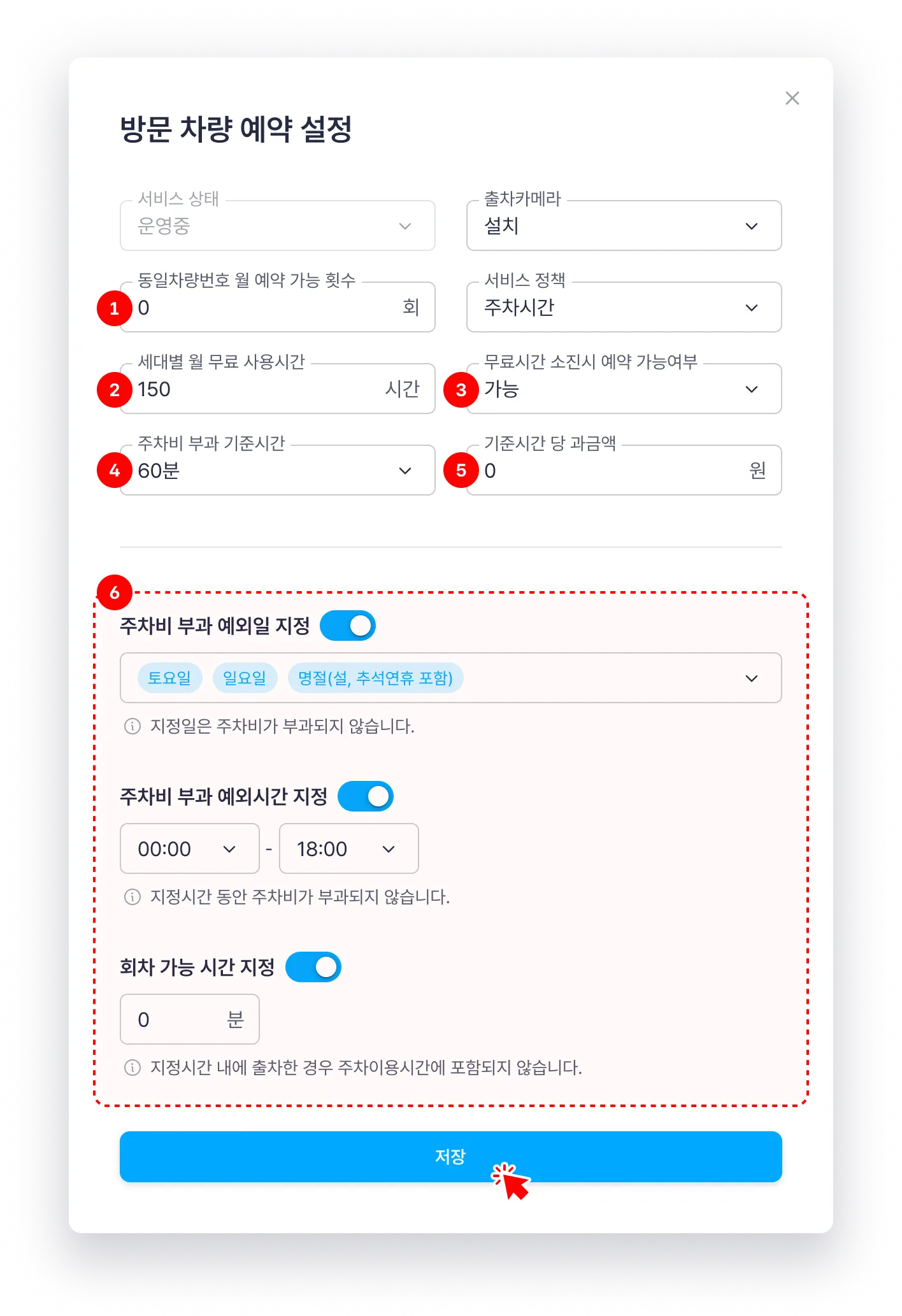 서비스 정책 : 방문 차량 타입에 따라 [주차시간], [주차횟수], [제한없음] 중 선택할 수 있습니다.