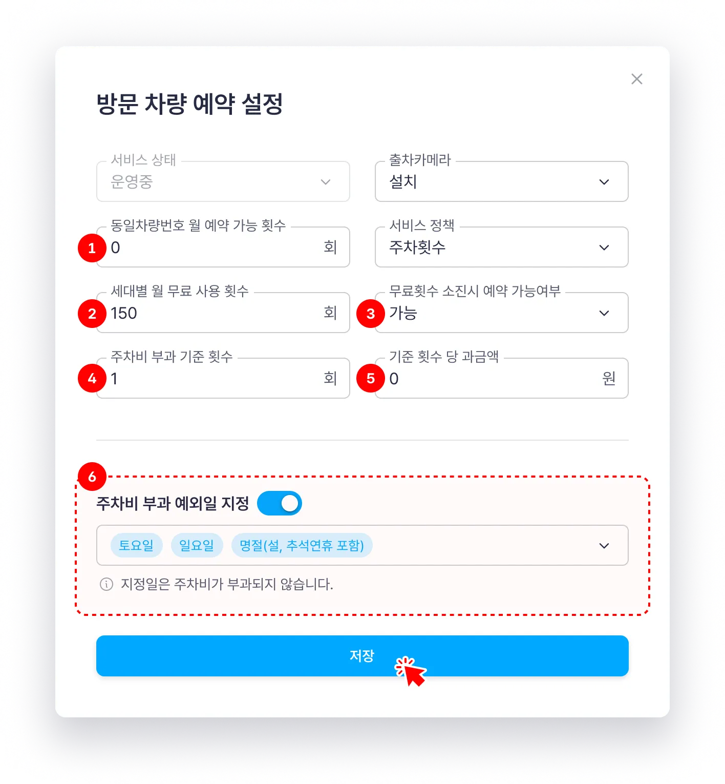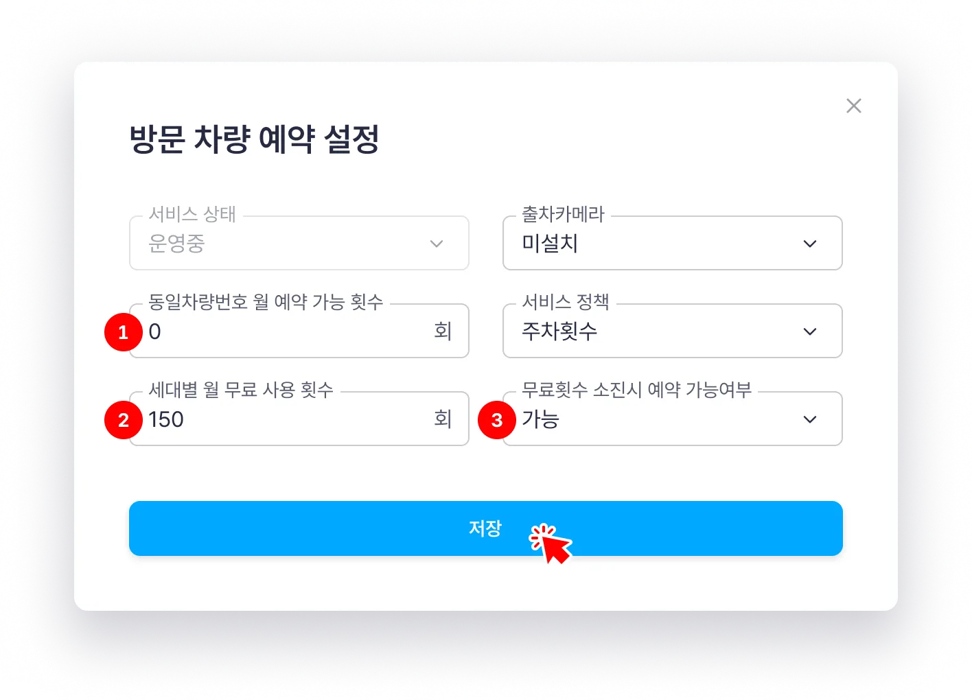 방문 차량 타입에 따라 [주차시간], [주차횟수], [제한없음] 중 선택할 수 있습니다.