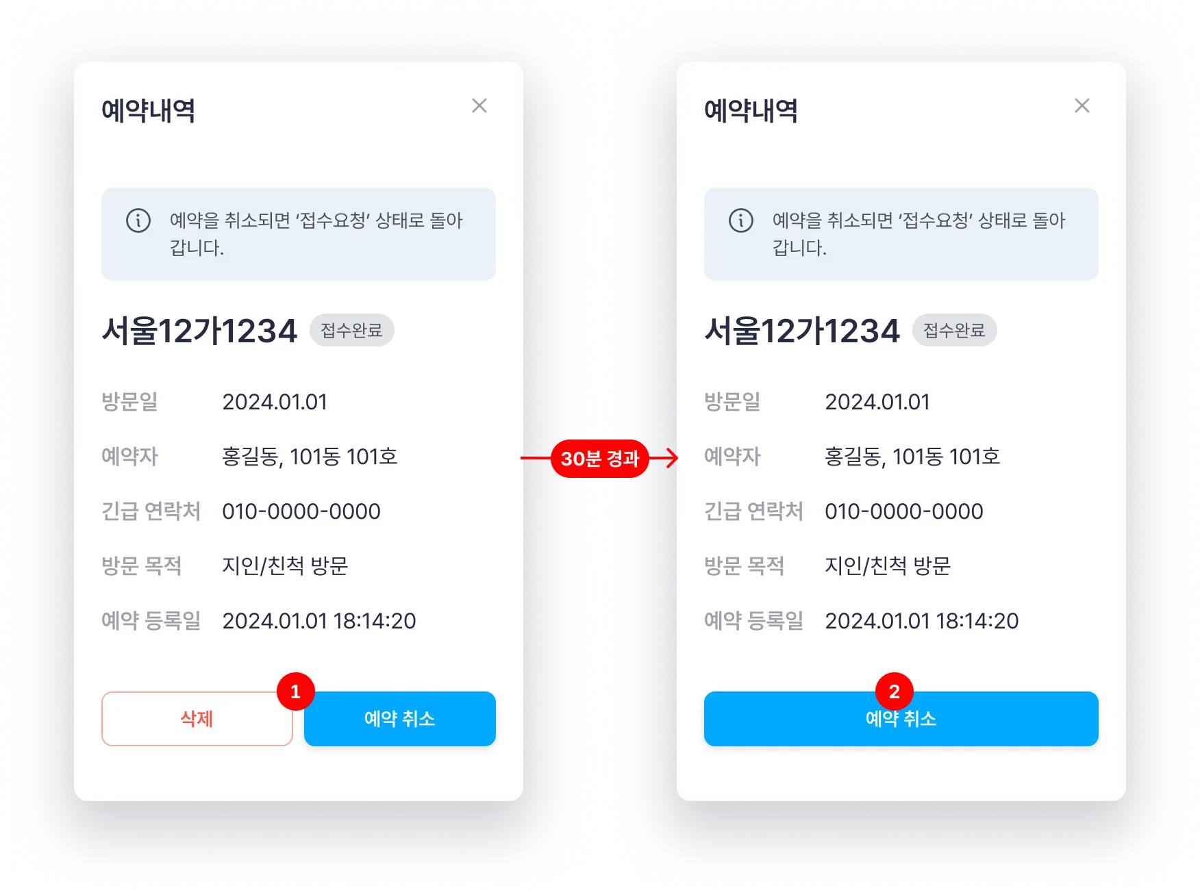 [접수완료]상태 30분 경과 후 : 예약취소만 가능합니다.