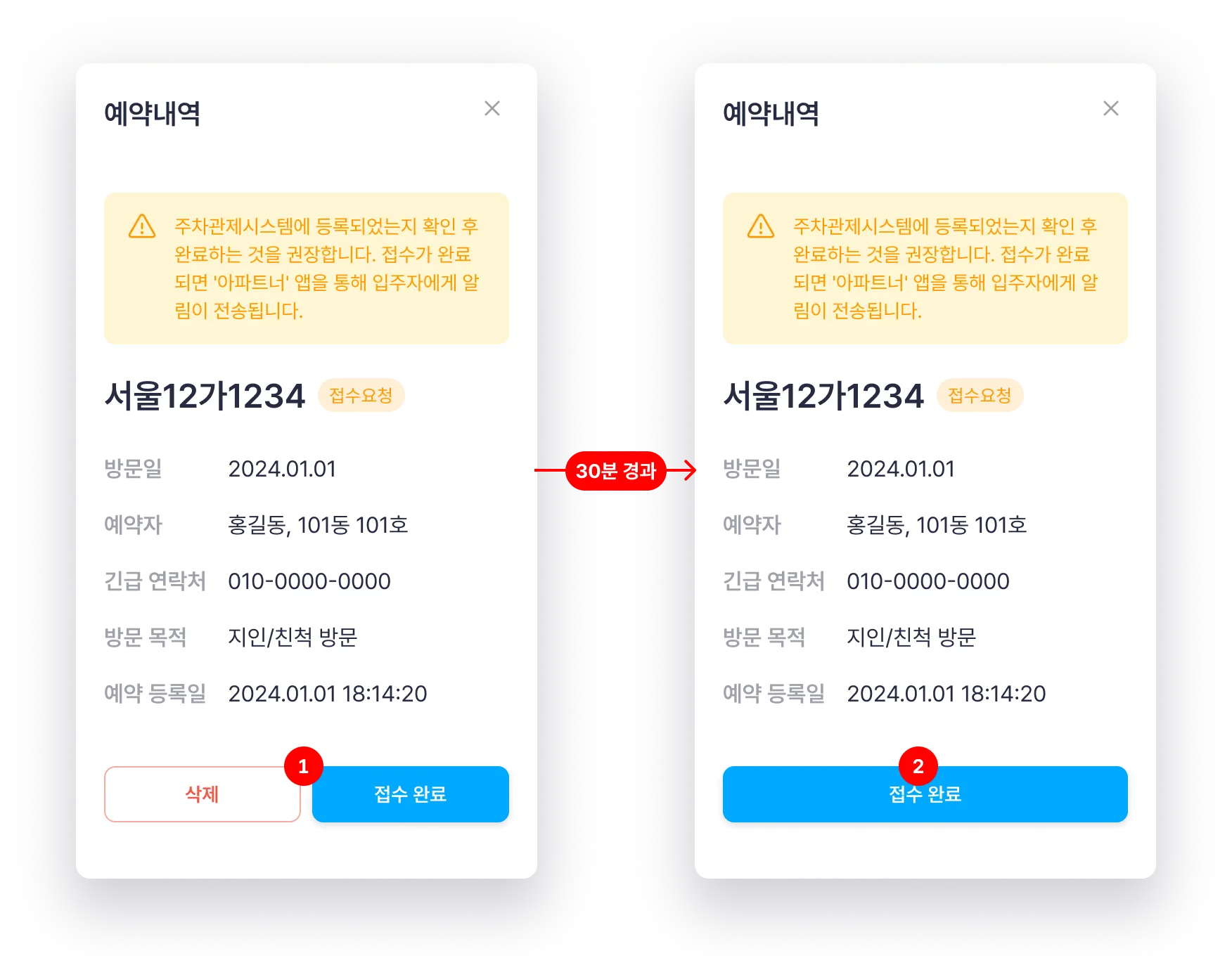 [접수요청]상태 30분 경과 후 : 접수완료만 가능합니다.