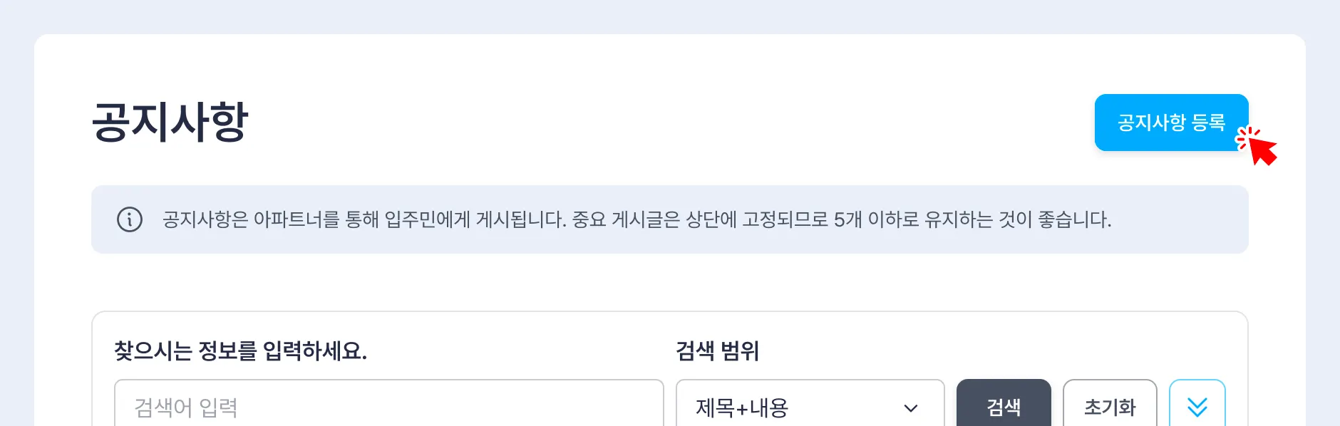 공지사항 화면 상단의 [공지사항 등록] 버튼을 클릭합니다.