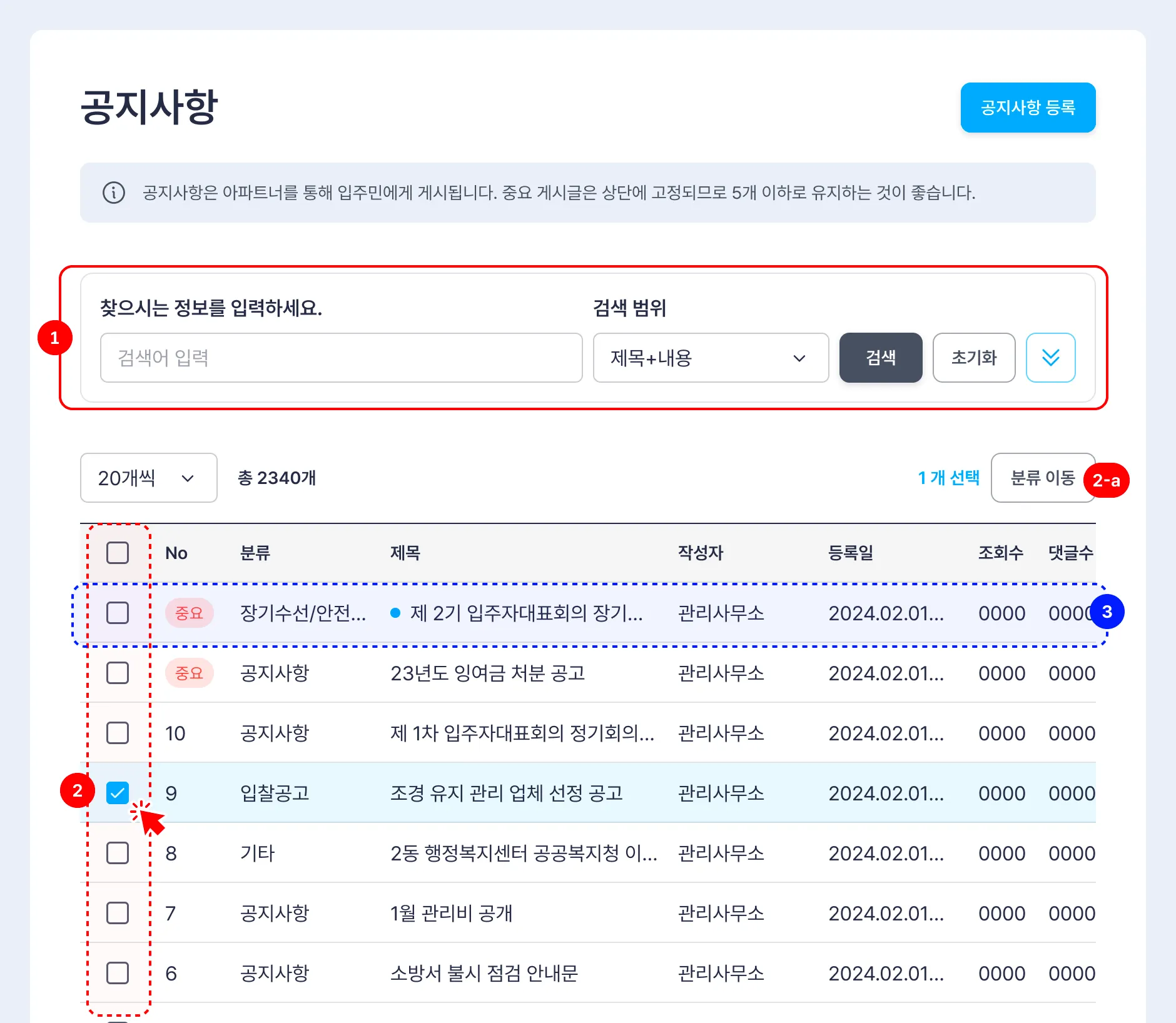 분류 변경을 원하는 게시글의 체크박스를 선택하면 [분류 이동] 버튼이 노출됩니다.