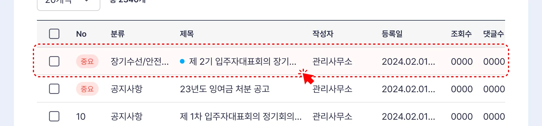 공지사항 게시글을 클릭하여 상세내용으로 이동합니다.