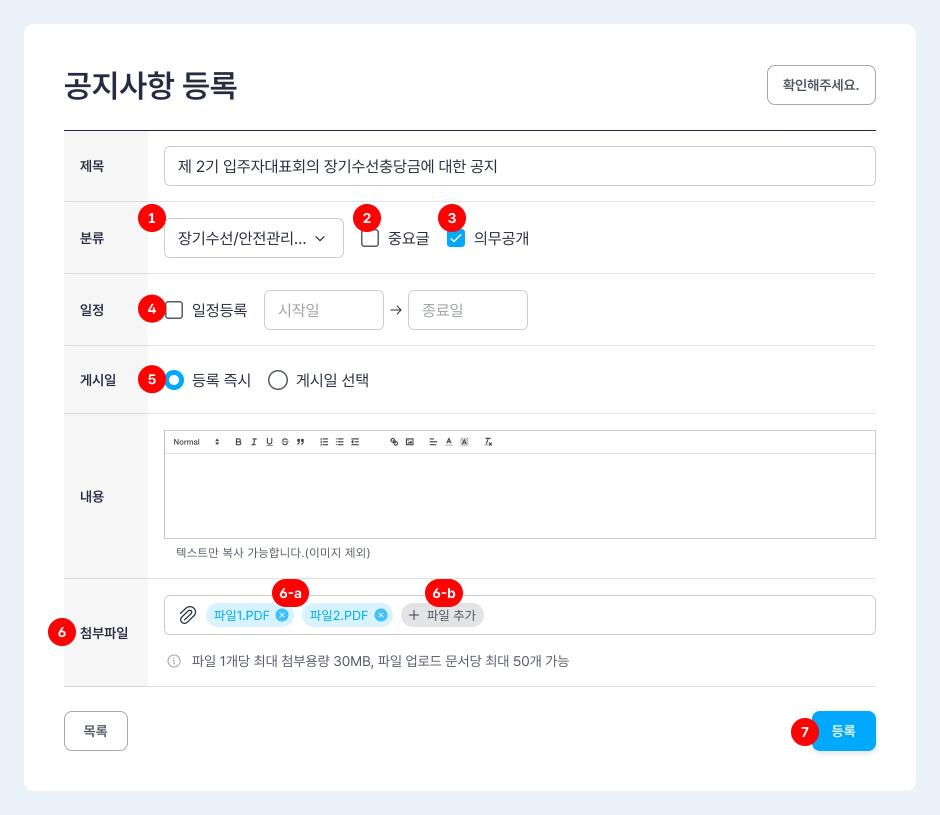 [의무공개]을 선택하면 ‘공지사항게시판’과 ‘의무공개 게시판’에 동시노출됩니다.