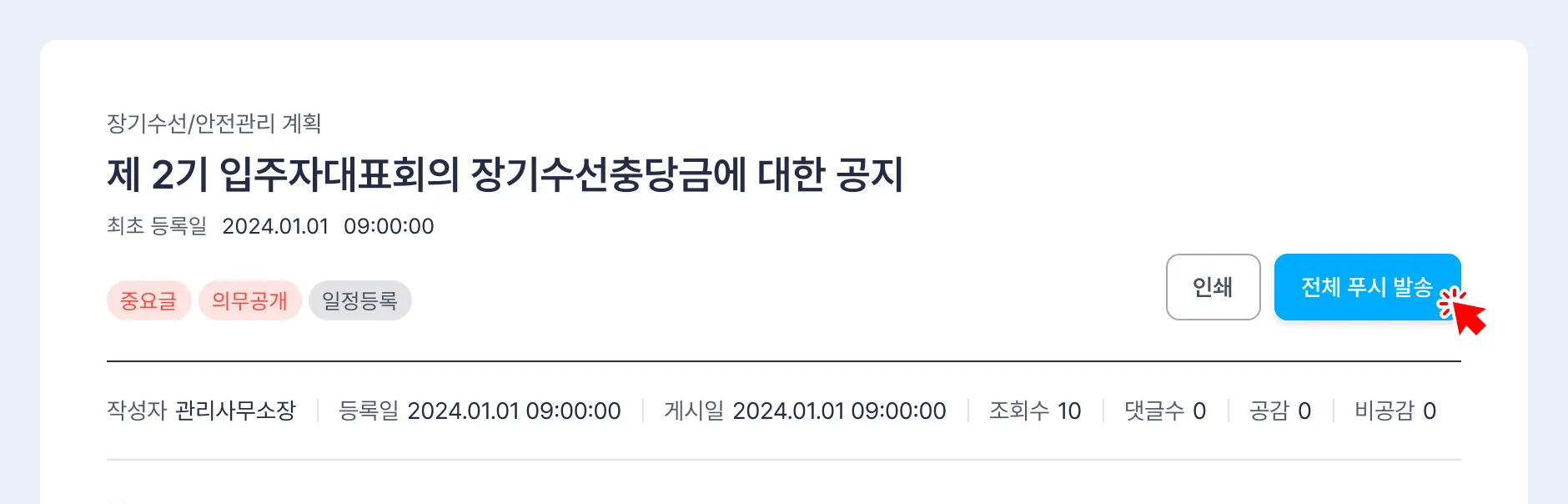 게시글 상단에 위치한 [전체 푸시 발송] 버튼을 클릭하여 입주민에게 알림을 전송할 수 있습니다.