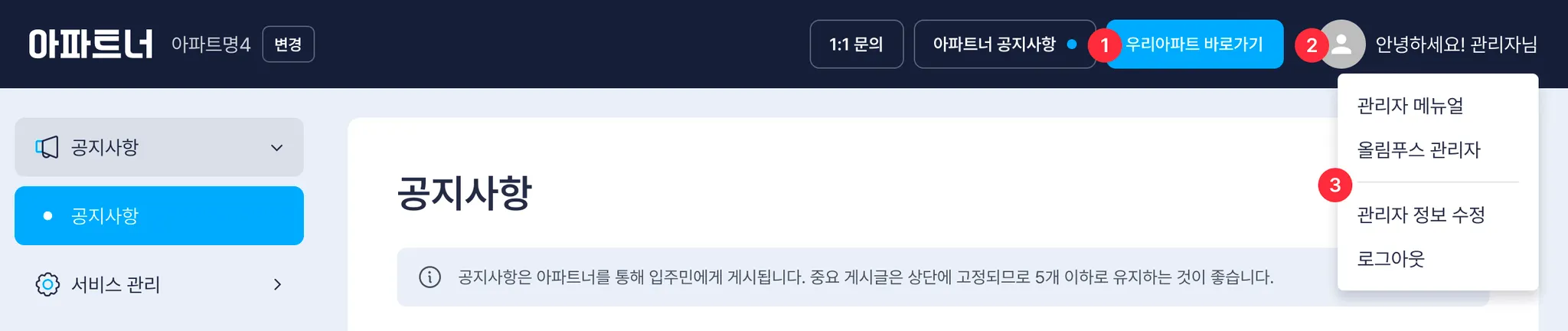 아파트너 앱의 관리자 기능을 사용할 수 있는 웹사이트입니다.