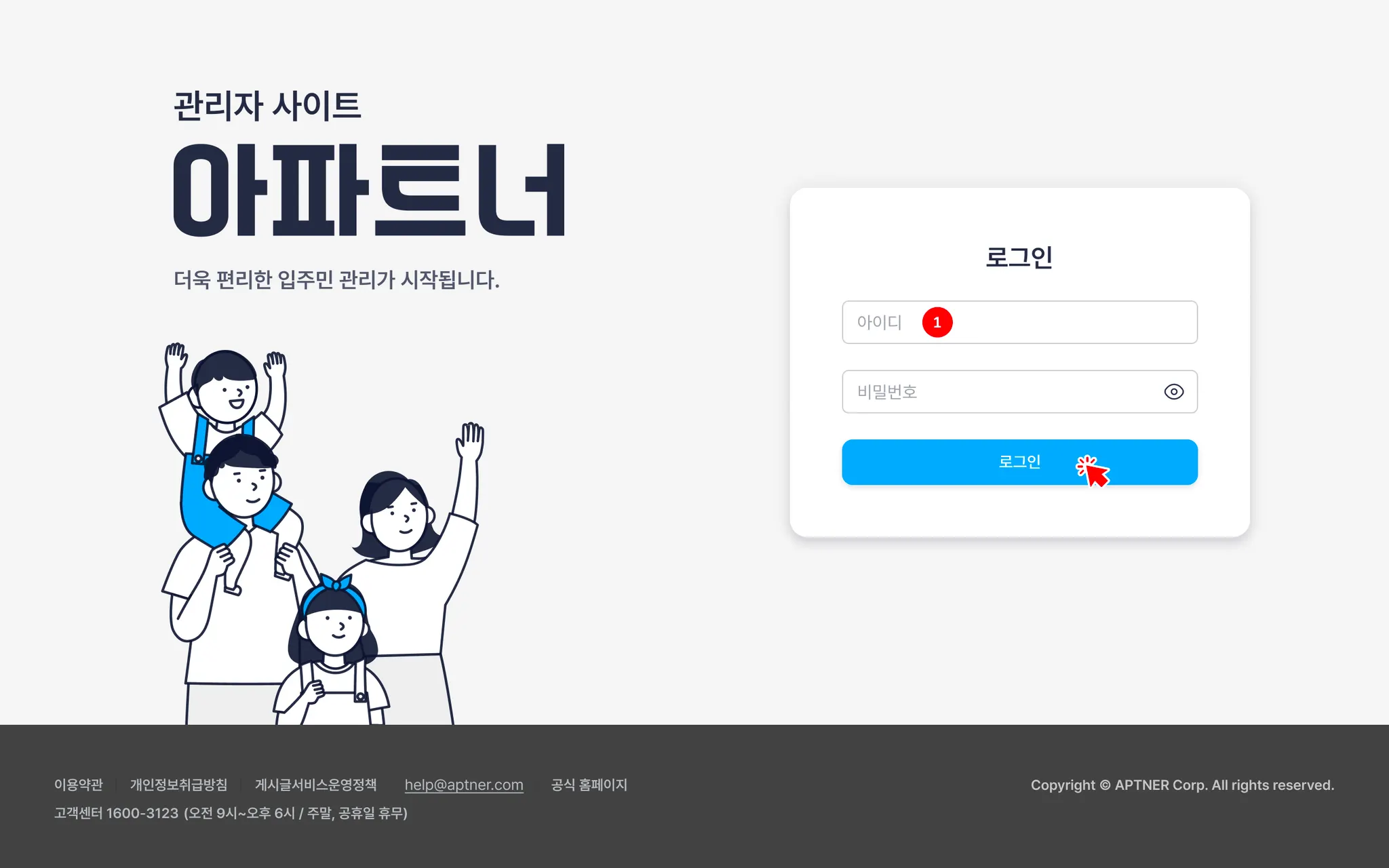 로그인 아이디는 아파트너에서 제공하는 아파트 홈페이지의 도메인입니다.